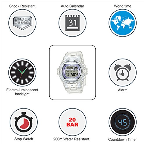 The face of this new 200-meter water resistant BABY-G model features eye-catching vivid color. An ion-plated metal ring combines with a face protector to create face that is dynamic, yet classic BABY-G. Both the case and band is done in a popular semi-transparent clear color. The wire face protectors on the case allow for worry-free wear at the beach, at the pool, or in other high-activity areas. Features include day counter, world time, tele-memo, and other functions that come in handy throughout the day. Shock Resistant - 200M Water Resistant - EL Backlight with Afterglow - 25pg Databank - World Time: 29 time zones (30 cities), city code display, daylight saving on/off - Day Counter - 5 Daily Alarms - Hourly Time Signal - 1/100 second stopwatch - Countdown Timer - Full Auto Calendar (pre-programmed until the year 2099) - 12/24 Hour Formats - Button Operation Tone on/off - Accuracy: +/- 30 seconds per month - Battery: CR1616 - Approx. battery life: 3 years - Module 3252 - Band Length: 135mm - 200mm - Size of case/total weight: BG169G 45.9 x 42.6 x 15.4mm / 45.3gFeature