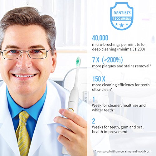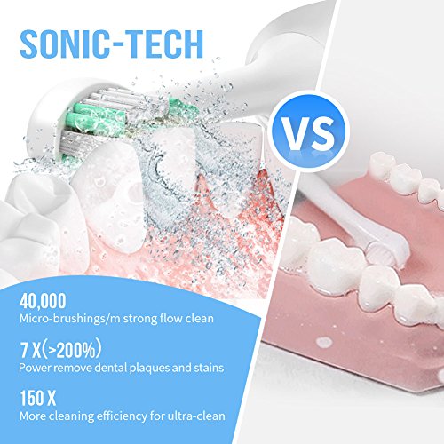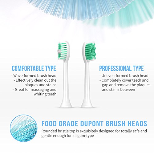2 Comfortable Head + 2 Professional Head Included - 2 comfy-styled bristles are wave-formed, effectively clean out the plaques and stains, also great for massaging and whiting teeth. - 2 Pro-styled bristles are uneven-formed, completely cover teeth and gap and remove the plaques and stains between. All BRISTLES are made of US Dupont nylon, to snug fit teeth shape for precisely oral cleaning and reach to hard areas. Moreover, Rounded bristle top is exquisitely designed for totally safe and gentle enough for all gum-type