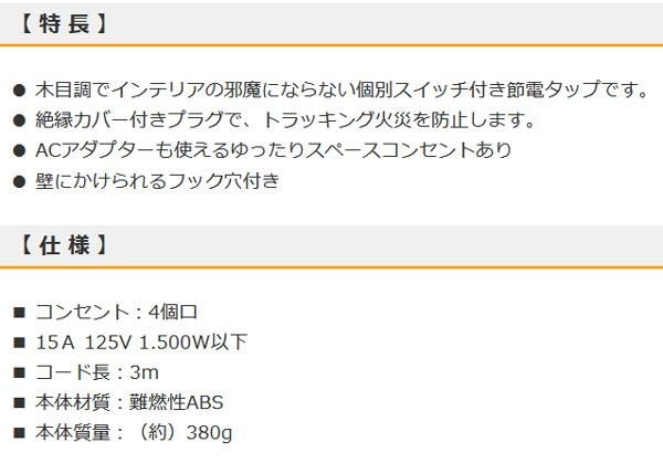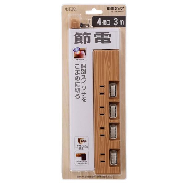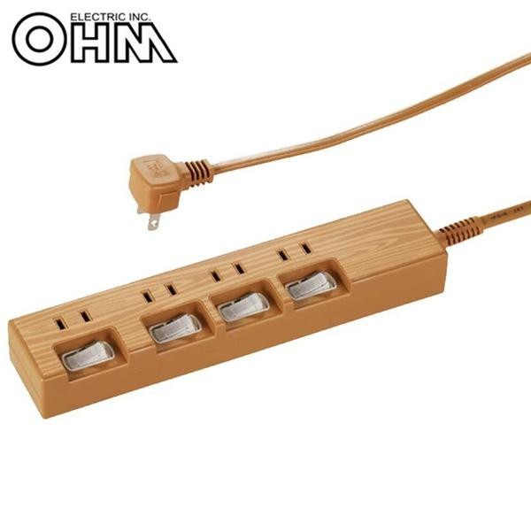 ACアダプターも使えるゆったりスペースコンセントあり。壁にかけられるフック穴付きです。 生産国:中国 ※サプライヤー直送品 ご注文後3~4営業日後の出荷となります【商品名】OHM 電源タップ 個別スイッチ付き 木目調 4個口 3m HS-TP43A44WO