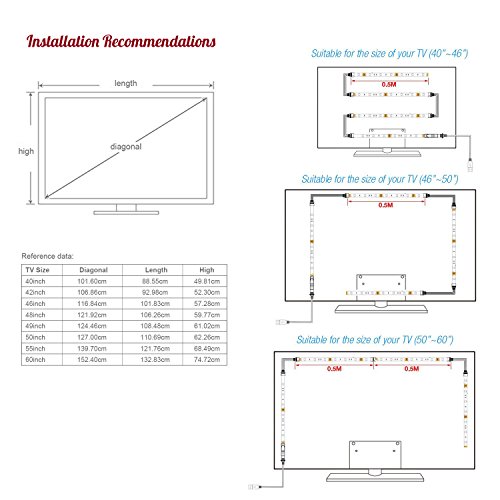 - EASY TO INSTALL - 4 x 1.64ft LED strips can be suitable for the majority of TV sizes. Different sizes have different choices, please refer to our installation recommendations to fit the desired size of your TV.