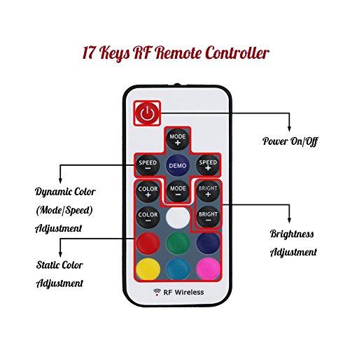 - WIRELESS CONTROL - Wireless remote control contrast infrared remote control, the advantage is: you can control the LED strip at any angle, change the LED strip color, brightness, and dynamic mode through the 17 keys RF wireless remote controller, which means no need to aim at the receiver when you operate.