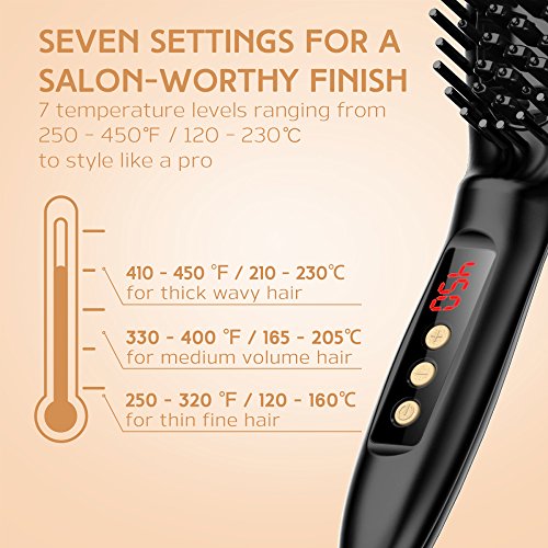 Be your own stylist at home and tame your unruly hair with USpicy Hair Straightener Brush. This easy-to-use straightener brush gives you quick, silky smooth, and professional looking straight hair in just a few minutes. You save time and money from not going to hair salons every time. The hair brush uses MCH (Metal Ceramic Heater) Technology to heat up to 450℉/230℃, allowing you to detangle and straighten hair by simply combing through it. It helps your hair become shinier and smoother. 7-level adjustable temperature with LED display lets you select the right amount of heat for your hair type. 30 minutes auto-off timer and automatic button lock help to prevent accidental button pressing and over use. You get frizz-free hair right from the first use with this brush straightener. Unique heat insulated tips protect your scalp from accidental burns. Heat-resistant and smudge-proof design keeps the handle cool and clean. Fully rotatable wire joint prevents wire twining and gives you smooth experience every time.Feature