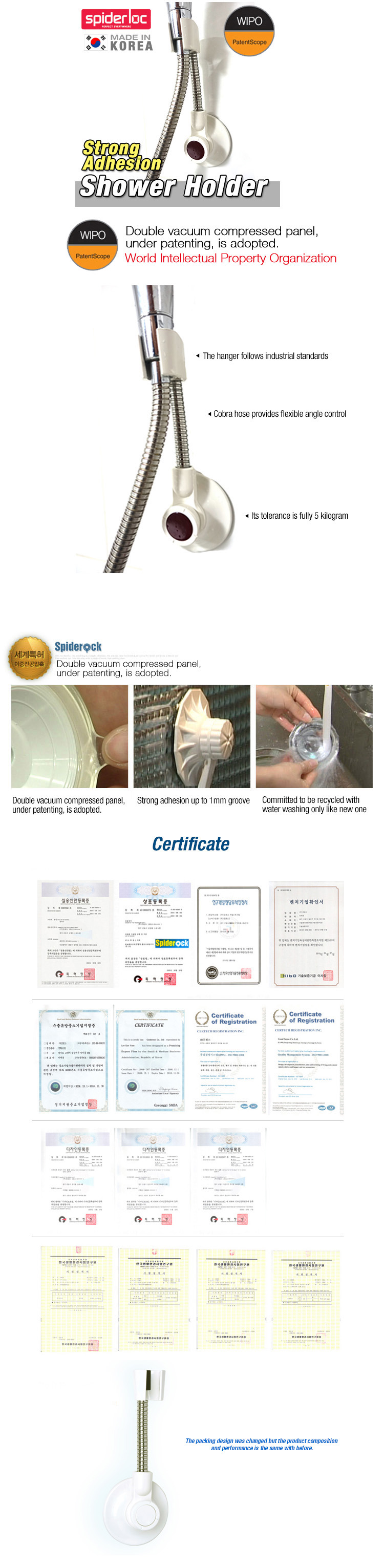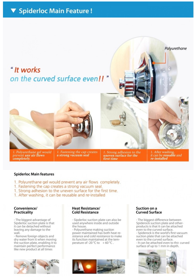 Gel type Polyurethane adsorption holds one more time! Dual vacuum suction system has very strong and powerful adsorption power Will not lose the adsorption power because of moisture or wetness. Very easy to attach and removing. Spiderloc’s dual vacuum suction systems are long time use so it is economical.