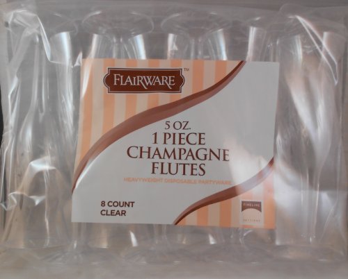 Product Description Why worry about your fine china getting broke or paying high prices from your cater. These 5 oz. clear plastic champagne flutes are perfect for weddings, parties, special dinners, catered events, or any other social event where you desire the elegance of fine china, but require the convenience of single use. Each plastic champagne flute is hard plastic, 1-piece design that looks like fine cut crystal. Each flute has a beautiful design. There is 8 per package