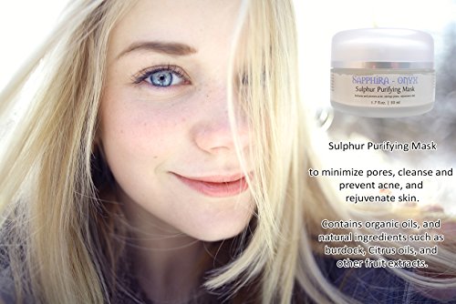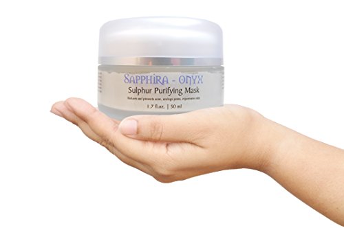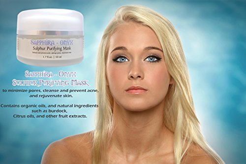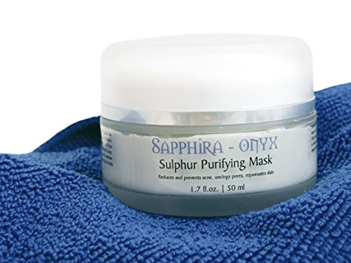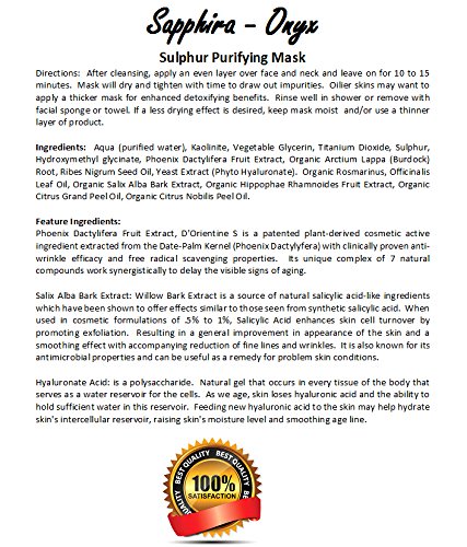 -. Feature : This Sulphur Purifying Mask minimizes pores, cleanses and prevents acne, and rejuvenates skin.Sapphira-Onyx is specifically designed with natural ingredients to detoxify your skin with a gentle mask that draws out impurities. Included is an exfoliating microfiber towel. / Contains organic oils, and natural ingredients such as burdock, Citrus oils, and other fruit extracts. Yes, we're a little more expensive than most, but we didn't want to skimp on our ingredients! / Our willow bark extract is a source of salicylic acid-like ingredients which have been shown to enhance skin cell turnover by promoting exfoliation. This is great for restoring youthful looking skin! / Sapphira-Onyx also shrinks and purifies pores; thus reducing the effects of acne and preventing future outbreaks. And a side benefit is the rejuvenated matte like appearance of skin. / As we age, we lose hyaluronic acid and the ability to hold sufficient water (we need this in every cell of our body!). Feeding new hyaluronic acid to the skin may help hydrate the skin's intercellular reservoir, raising skin's moisture level.