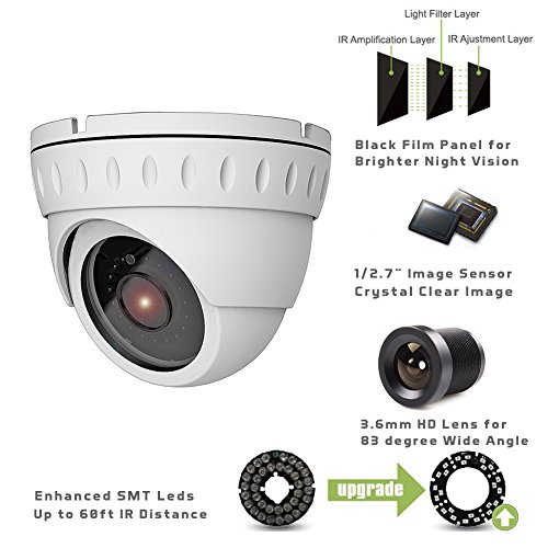 -. Feature : WIDE ANGLE CRISP IMAGE: 1/2.7-inch CMOS sensor & Megapixel Lens for crystal clear day and night image with wide view. / ENHANCED NIGHT VISION: Latest tech anti-reflection black film panel, IR filter and upgraded Led for superior image at night. / IP66 COMPACT DESIGN: Compact size for easy installation; Recommend installing it indoor or on porch. / 4 MODES VIDEO OUTPUT: 2.0MP HDTVI, 2.0 MP HDCVI, 1080 AHD and 960H wired BNC output. / WARRANTY: 60 DAY money back guarantee, 24 MONTH warranty and friendly, easy-to-reach support; Power supply, coaxial video cable and DVR are NOT INCLUDED but required.