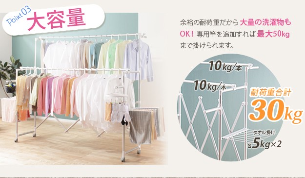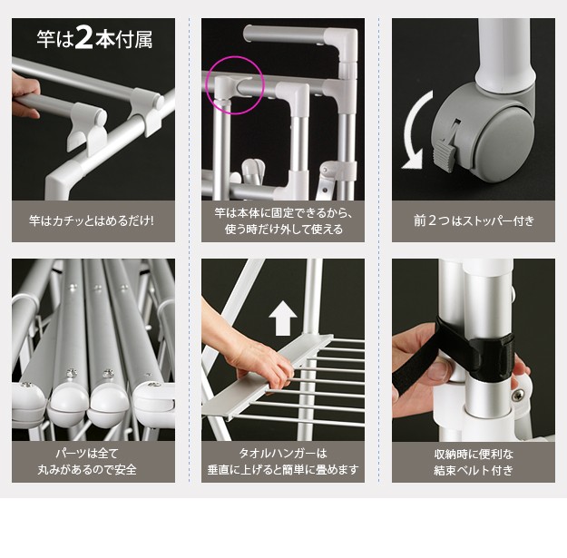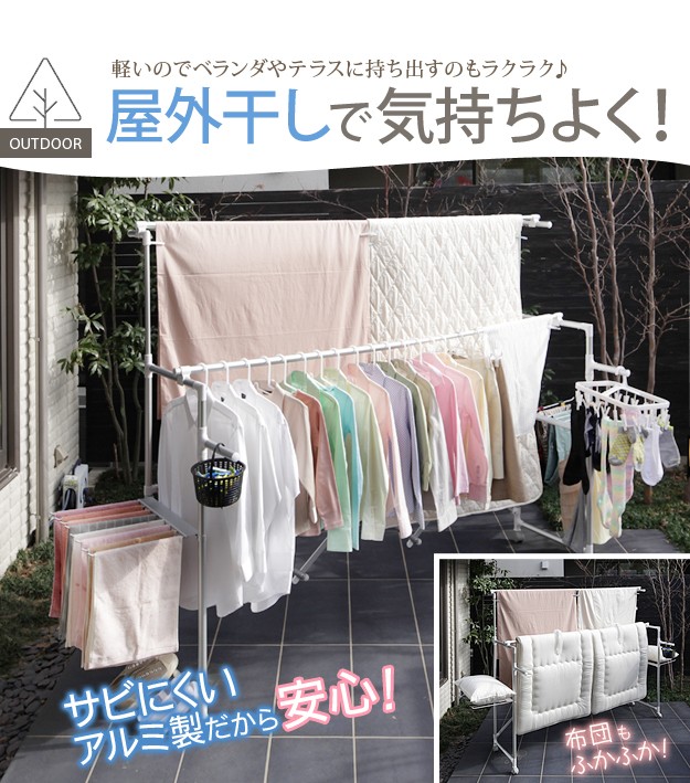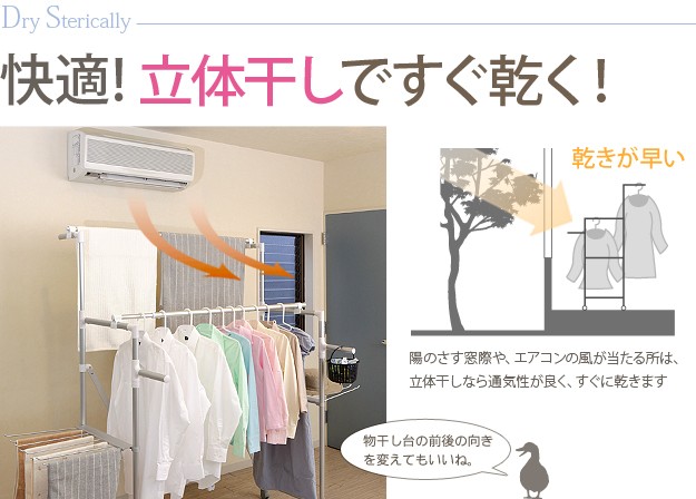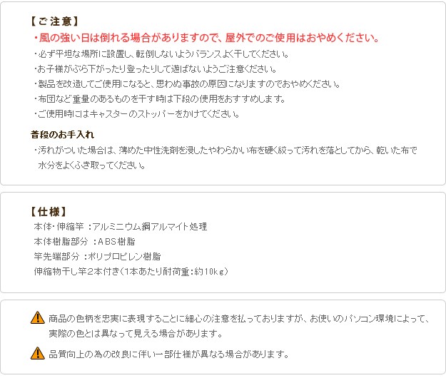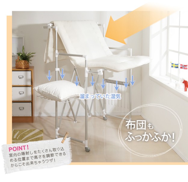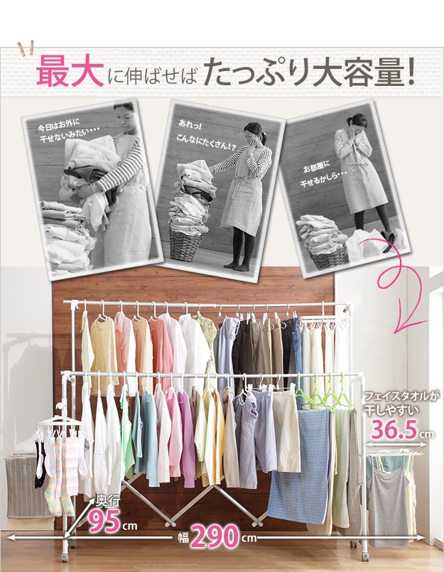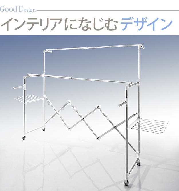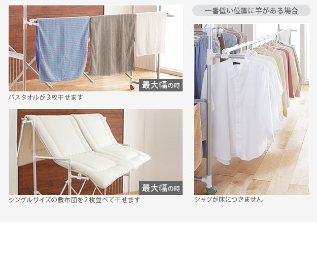 商品について:場所や洗濯物の量に合わせて幅も高さも伸縮自在!スペースを無駄なく活用できる室内物干し。大きな洗濯物までしっかり干せて花粉や梅雨の季節も安心☆竿(別売)を追加すれば布団を立体的に干せます。キャスター付きですので収納や移動もラクラク♪