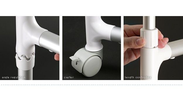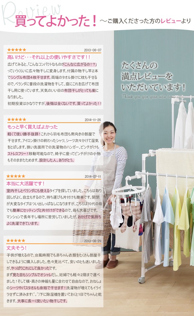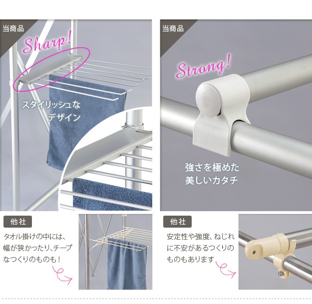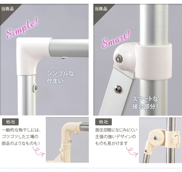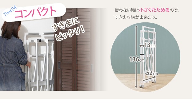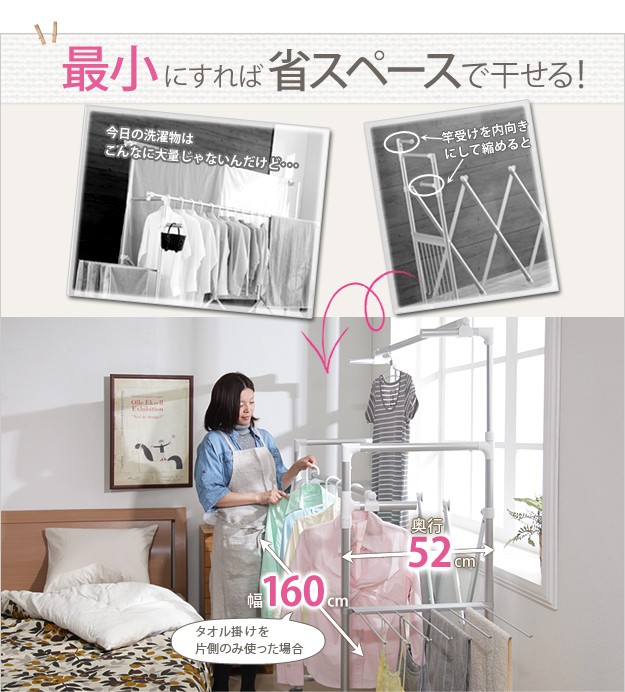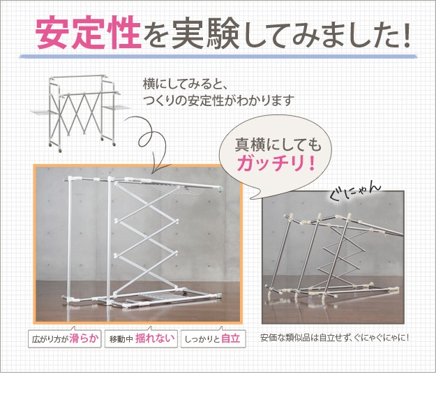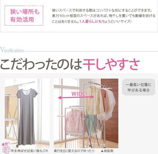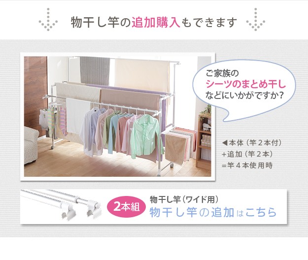 商品について:場所や洗濯物の量に合わせて幅も高さも伸縮自在!スペースを無駄なく活用できる室内物干し。大きな洗濯物までしっかり干せて花粉や梅雨の季節も安心☆竿(別売)を追加すれば布団を立体的に干せます。キャスター付きですので収納や移動もラクラク♪
