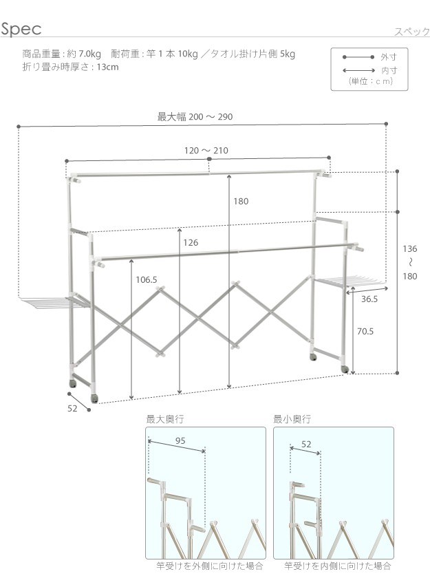 サイズ(cm):幅120~210x奥行52x高さ136~180cm・重量約6.5kg、耐荷重約10kg/竿(本)