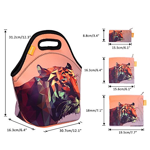 -. Feature : ONE STEP TOWARDS A SUSTAINABLE LIFESTYLE - Made up of lead and pvc-free materials to keep your family's food safe and avoid pollution to environment due to use of a large number of paper or plastic bags. / EXTRA 3 BAGGIES - A set of 3 snack and sandwiches baggies are included as bonus to add more capacity to keep a variety of your favorite lunch food and ready to eat. / INSULATED BY NEOPRENE (LUNCH BAG) - The high-density thermal insulation will keeps food cold (or warm) for up to hours, depending on the outside temperature. / CERTIFIED FOOD-SAFE (SNACK BAGGIES) - Made from cotton fabric lined with food-safe polyester lining that's been tested lead-free, BPA-free, PVC-free, and phthalate-free, 3 different sizes allow you to place snacks or sandwiches. / DIMENSIONS: Lunch bag measures 12"L x 11"H x 6"W; 3 sizes of baggies: large - 7"x8"; medium - 6.5"x6.5"; small - 6.5"x3".