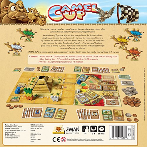 -. Binding : Toy -. Brand : Z-Man Games -. EAN : 0681706714806 -. Feature : Fun family game / 2014 Spiele des Jahres winner / For 2-8 players -. Genre : strategy -. IsAdultProduct : 0 -. ItemPartNumber : ZMG71480 -. Label : Flat River Group -. Manufacturer : Flat River Group -. Model : ZMG 71480 -. MPN : ZMG 71480 -. PackageQuantity : 1 -. PartNumber : ZMG 71480 -. ProductGroup : Toy -. ProductTypeName : TOYS_AND_GAMES -. Publisher : Flat River Group -. ReleaseDate : 2014-08-25 -. Studio : Flat River Group -. Title : Camel Up Game -. UPC : 754295785998 -. Warranty : No Warranty