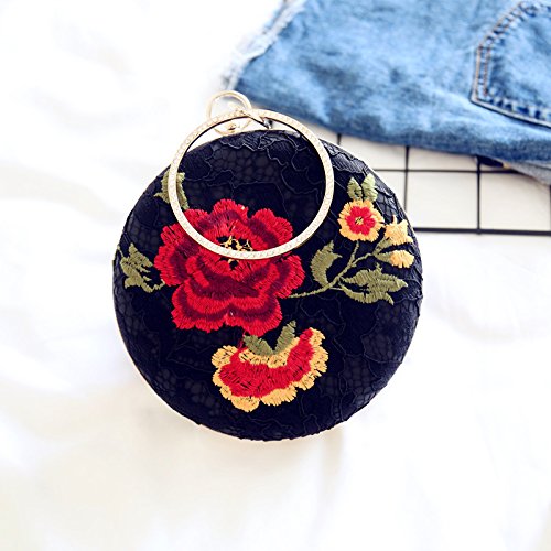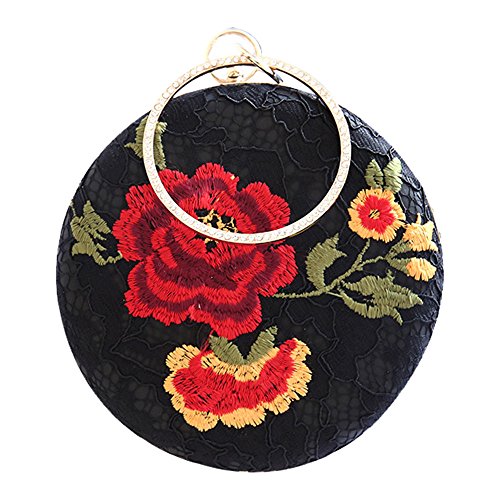 Product Description Beautiful red peony flower embroidered front, contrast with the black lace background. This unique design retro evening bag for women. Sparkly jewels beaded top handle circle. Perfect for night out, date, cocktail party, family reunion, prom, wedding, party, formal dinner and so on. 0