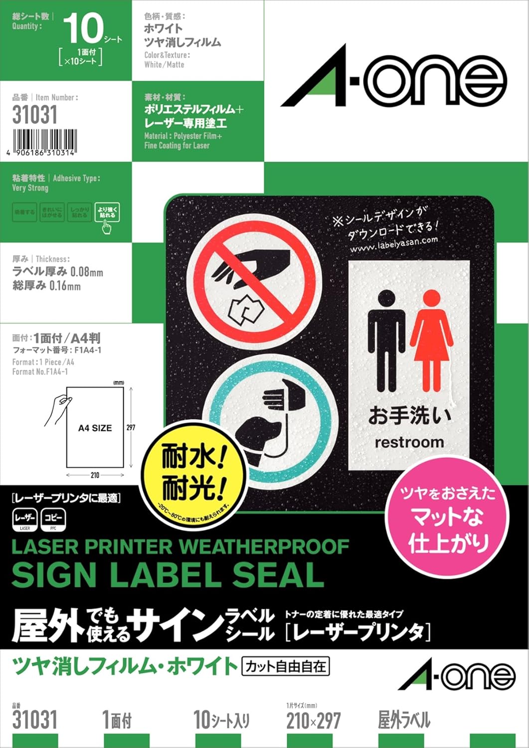 ツヤ消しフィルム・ホワイト/材質:ポリエステルフィルム/標準総厚み:0,16mm/ラベル厚み:0.084mm A4判 ノーカット/シートサイズ:A4判(210mm×297mm)/ラベルサイズ:210mm×297mm(1列×1段) 対応プリンタ: レーザー コピー