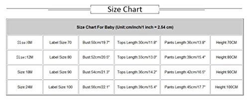 Product Description??Size:6M----Label Size:70----Bust:50cm/19.7"----Tops Length:30cm/11.8"----Pants Length:36cm/13.8"----Height:70CM ??Size:12M----Label Size:80----Bust:52cm/20.5"----Tops Length:33cm/13.0"----Pants Length:39cm/15.4"----Height:80CM ??Size:18M----Label Size:90----Bust:54cm/21.3"----Tops Length:36cm/14.2"----Pants Length:42cm/16.5"----Height:90CM ??Size:24M----Label Size:100----Bust:56cm/22.1"----Tops Length:39cm/15.4"----Pants Length:45cm/17.7"----Height:100CM0