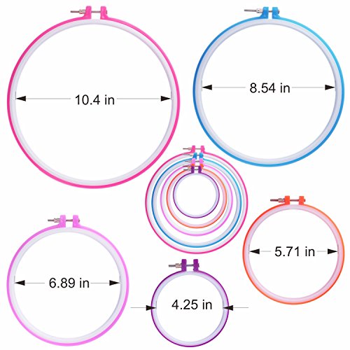 - Valuable Set: 5×Embroidery hoops-5''(12.7cm),6.5''(16.5cm),7.8''(20cm),9.7''(24.5cm),10.8''(27.5cm) + 1×12 by 18-Inch aida+ 100 colors threads+ 6×embroidery needles+ 2×needle-threading tools+ 1×Scissors +1×untwist tool+2×Thimble ring+2×Needle-thrusting tool