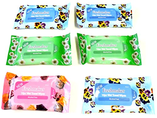 Lot of 6 Packs Travel Size 10 Pack Wet Towel Wipes Baby Wipes Fits in Purse Diaper Bag & Glove Compartment