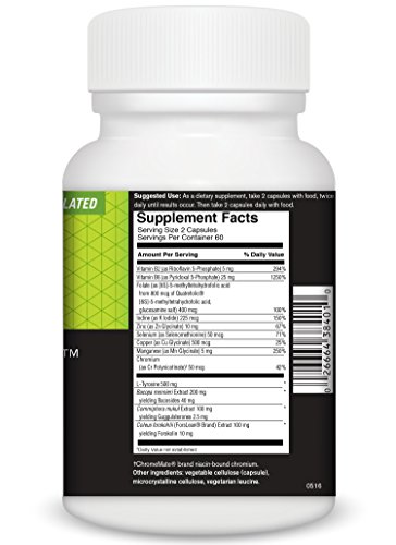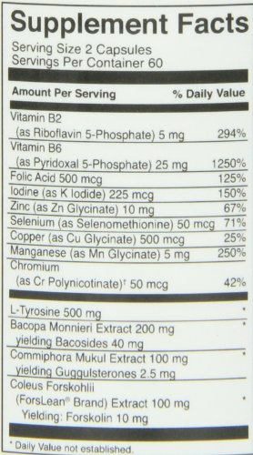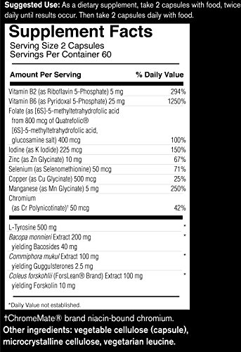 Thyroid basics thyroid basics is a dietary supplement to support thyroid function and health. It is a vegetarian blend of tyrosine, selenium, iodine, copper, zinc, manganese, for lean brand coleus forskohlii, bacopa monnieri, guggulsterones, chromium and b vitamins all of which work together to optimize thyroid function, relieve fatigue, manage weight, appetite and mood , improve t4 and t3 ratios and elevate cellular metabolism .As a dietary supplement, take 2 capsules with food, twice daily until results occur, then take 2 capsules daily with food. Supplement facts serving size 2 capsules servings per container 60amount per 2 capsules: Vitamin b2 (riboflavin 5-pHospHate) , , 5 mg 294%vitamin b6 (pyridoxal 5-pHospHate) , ,25 mg 1250%folic acid ,, . 500 mcg 125%iodine (k iodide) ,, ,225 mcg 150%zinc (zn glycinate) ,10 mg 67%selenium (selenomethionine) , ,50 mcg 71%copper (cu glycinate) ,, 500 mcg 25%manganese (mn glycinate) ,,5 mg 250%chromium (chromemate cr polynicotinate) . 50 mcg 42%l-tyrosine 500 mgbacopa monnieri (20%) extract ,.200 mgcommipHora mukul extract ,, . 100 mgcoleus forskohlii (forslean brand) extract ,100 mgyielding forskolin ,, 10 mgother ingredients: Vegetable cellulose, rice flour, vegetable stearate.Do not use if you have an over-active thyroid, bleeding disorders, cardiovascular disease or hormone sensitive conditions, or if you are on blood-thinners, calcium channel blockers, nitrates, cytochrome p450 drugs, statin drugs, or hormone replacement therapy.If pregnant or nursing, consult with your health care professional before taking this product.Feature