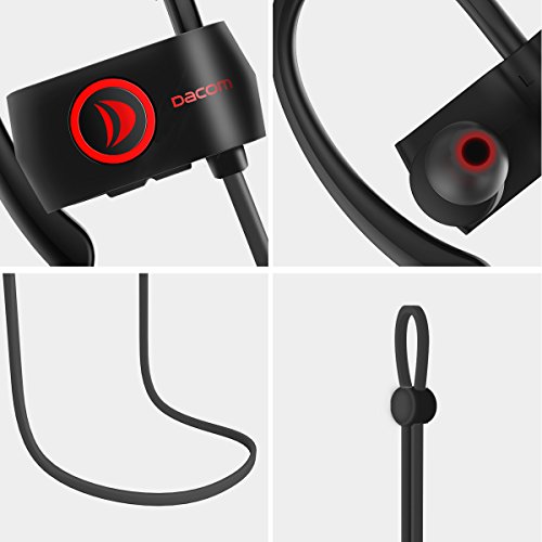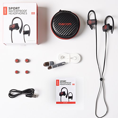 -. Binding : Wireless Phone Accessory -. Brand : DACOM -. Feature : ★SUPER COMFORTABLE, SECURE FIT : These sports earbuds are designed for working out.You will be impressed by how they securely and stably fit your ears. The function of hooking over the ears always secure earbuds staying on your head.Oblique angled ear fittings also naturally match the curve of your ear canals while 3 sets of included ear tips ensure a comfortable secure fit. They don't fall out throughout your work on the mat, treadmill, cross trainers and overhead equipment. / ★IPX7 WATERPROOF &SWEAT-PROOF: We applied almost all waterproof features possible in such compact design: Coated PCB, waterproof earbud mesh, sealed button, and most importantly, sealed charging port, which makes them meeting one of the highest waterproof standard: the IPX7. So you can still listen to music and boost performance even if you're sweating and moving quickly. / ★LONGEST PLAY TIME: We understood that battery life makes a lot of difference in experience, that's why we boost the battery capacity up to 120mAh. With 1-2 hours of charging, you can enjoy 6-8 hours of music and 6 hours of phone talk, Our bluetooth 4.1 wireless connection to your device, you can enjoy wireless sound and communication range as far as 10M, with no compromising on sound quality and stability.The wireless range they stay connected is impressive! / ★INCREDIBLE TRUE HD SOUND - Our wireless headphones use Bluetooth 4.1 CSR technology with aptX and cutting edge components. Hear guitar solos, treble and strong bass like you're listening live! / ★100% MONEY BACK GUARANTEE: When you put our bluetooth headphones on if you don't experience great sound quality and comfort along with absolutely loving them we will refund your money. Our world-class Dacom customer service wants you to be SATISFIED with your purchase. Absolutely no risk. The earbuds come with our 100% satisfaction guarantee. Get a pair for you and more for friends and family TODAY! -. Label : DACOM -. Manufacturer : DACOM -. Model : L08 -. PackageQuantity : 1 -. ProductGroup : Wireless -. ProductTypeName : WIRELESS_ACCESSORY -. Publisher : DACOM -. Studio : DACOM -. Title : Workout Headphones,Wireless Bluetooth Earbuds,HiFi Stereo In-Ear Headset Best Earphones For Running! 8 Hours Playtime,Lightweight Sweat & Water Proof IPX7, Mic by Dacom