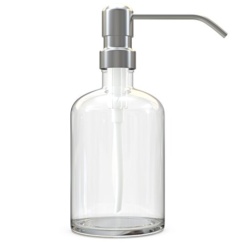 Recycled Clear Glass Soap Dispenser with Extra Long Stainless Steel Pump. 100% Quality Guarantee. Classic Modern Design for Kitchens or Bathrooms. Stylish Packaging with Re-usable Drawstring Bag.