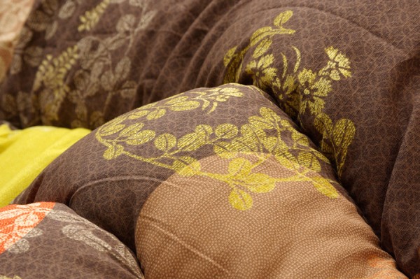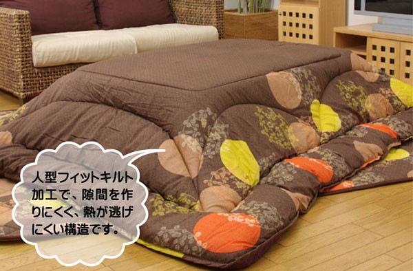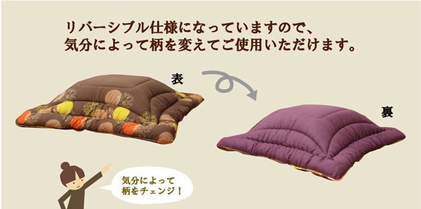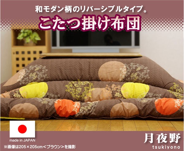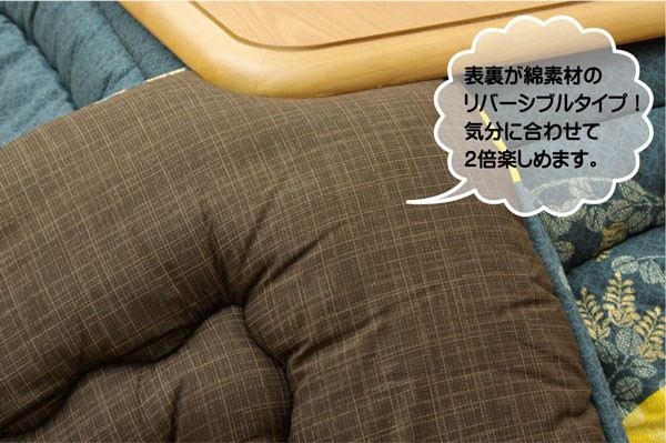 和モダン柄のこたつ布団です。熱が逃げにくいフィットキルト加工を施しています。生地には肉厚で張りと光沢のある綿素材を使用しています。両面使用可能なリバーシブルタイプです。こちらの商品は国内でプリント、綿入れしています。日本製のプリントらしい上質な質感と繊細な文様をお楽しみ下さい。部分暖房のこたつは電気代もおトクです。