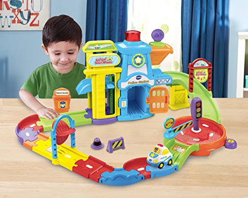 Sound the alarm at the Go! Go! Smart Wheels Police Station Play set from VTech! Speed off to the 911 call in the police car, zoom around the spinning disc and lock the criminal in jail. The play set includes a variety of manipulative features and two play pieces.