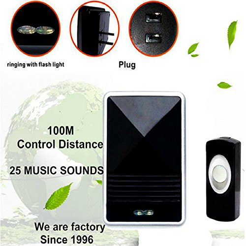 -. Feature : Long Range up to 328 feet / 100 meters - Either you are occupied in the garden or at the kitchen, it can remind you that someone is calling from outside. / This doorbell is totally wireless and no battery required for receiver, Remote require 1 x 23A 12V Battery ( NOT INCLUDED ) . No more annoying wirings and cables! / Built-in stereo loudspeaker, 25 chime melodies, the sound is ringing and dulcet, suitable for home, factories, office buildings and hotels. / Easy to Install: Unlike traditional models, there's NO fancy wiring required. Just plug the receiver into an electrical outlet (no batteries needed for the plug-in receiver), and mount the push button base on the wall with double-sided adhesive tape / What You Get: 1PC Wireless Doorbell Receiver 1PC Remote Control