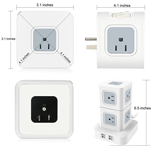 Max Wattage: 1875W Voltage Compatibility: AC 100V-240V Rated Current: 15A (Max) Rated Voltage: 125V USB Charger Output: 5V==2.4A*4 (Max 3.4A) Outlet Quantity: 9 AC outlets 4 USB ports Material: V0 Level Fire-resistant PC ABS Switch: 2 individual On/ Off switches Cord Length: 6 Feet Cord Standard: 14AWG Plug Standard: US Plug Dimensions: 6.5*4.7*4.7 inches Weight: 1.5 lb Security Protection: Surge/ Overload/ Over-heated/ Over-voltage/ Over-current/ Short circuit Protection, Fire-resistance What You Will Get: