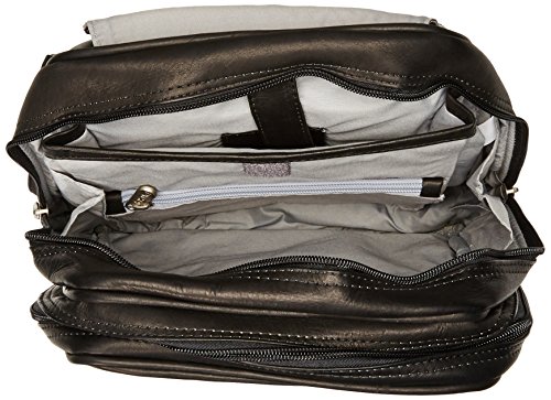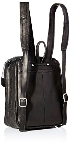Magnetic flap with front zip-pocket opens to reveal two large zippered compartments and a large zip-pocket. Front section with full organizer, window ID pocket, and a large interior zip-pocket. Rear section complete with padded tablet pocket and an interior zip-pocket. Rear open pocket, top handle, & adjustable padded backpack straps