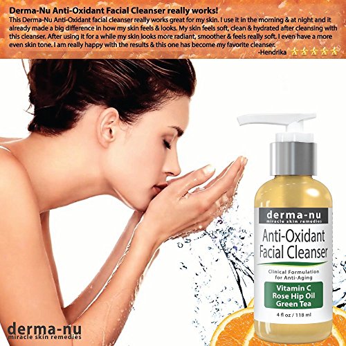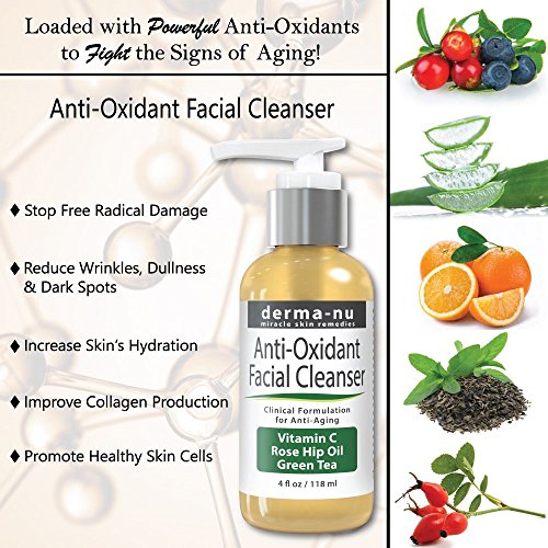 Derma-nu Anti Oxidant Facial Cleanser reverses the oxidizing free radical process for smoother, younger, happier and truly vibrant skin. Formulated with 97% natural and 72% organic ingredients. We only use the highest quality natural and organic ingredients in our formulations. Free radical damage, called oxidation, shows up in our skin as wrinkles and sagging. The cellular matrix of our cells collapses under the ongoing attack of free radicals. Antioxidants HALT AND REVERSE this intracellular and extracellular attack. This Extreme Antioxidant Face Wash combats cellular aging via the suppression and deactivation of dangerous and damaging free radicals. Loaded with potent antioxidant and superhero free radical fighters, this miracle wash will give you the boost, lift and shine that every person with skin looks for in a skin care product. If within 30 days you are not 100% happy with your purchase of Derma-nu Anti Oxidant Facial Cleanser, let us know and we will refund your entire purchase price.Feature