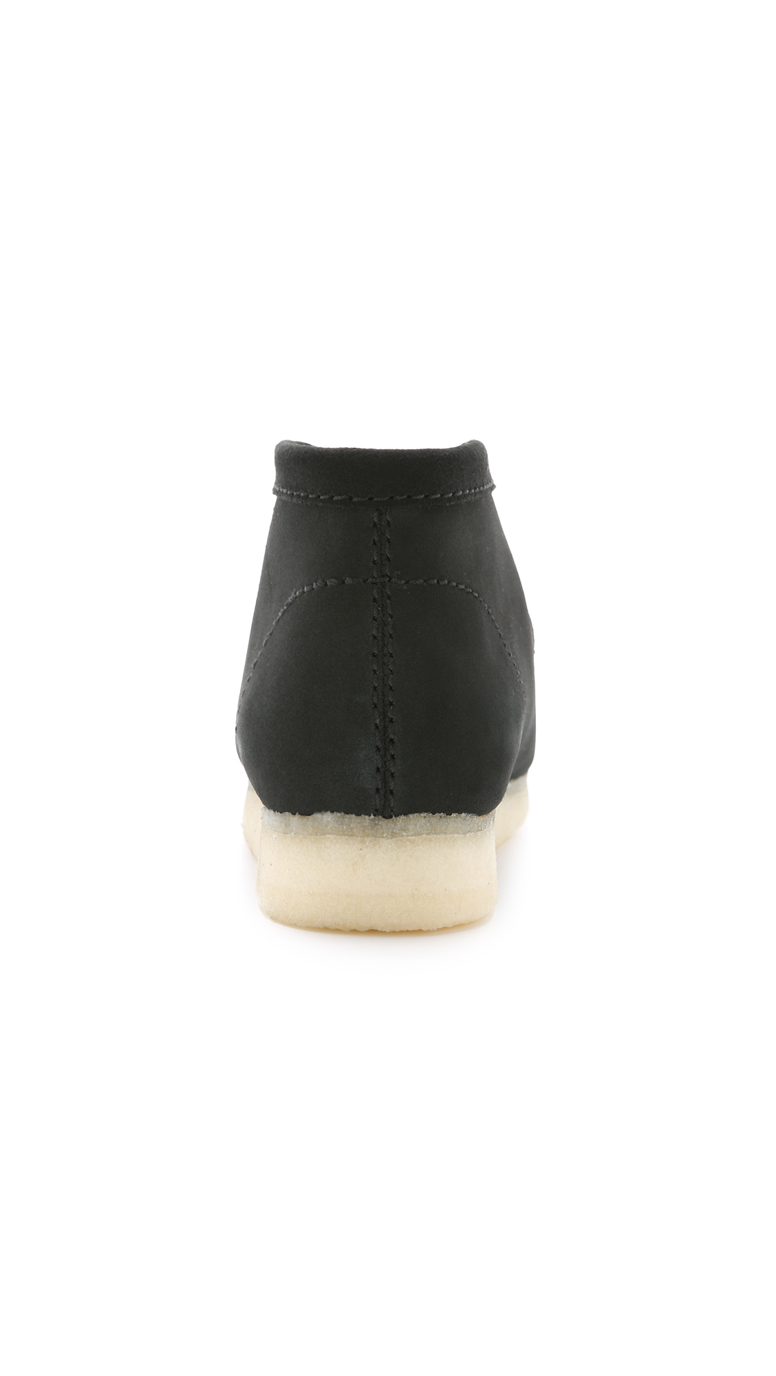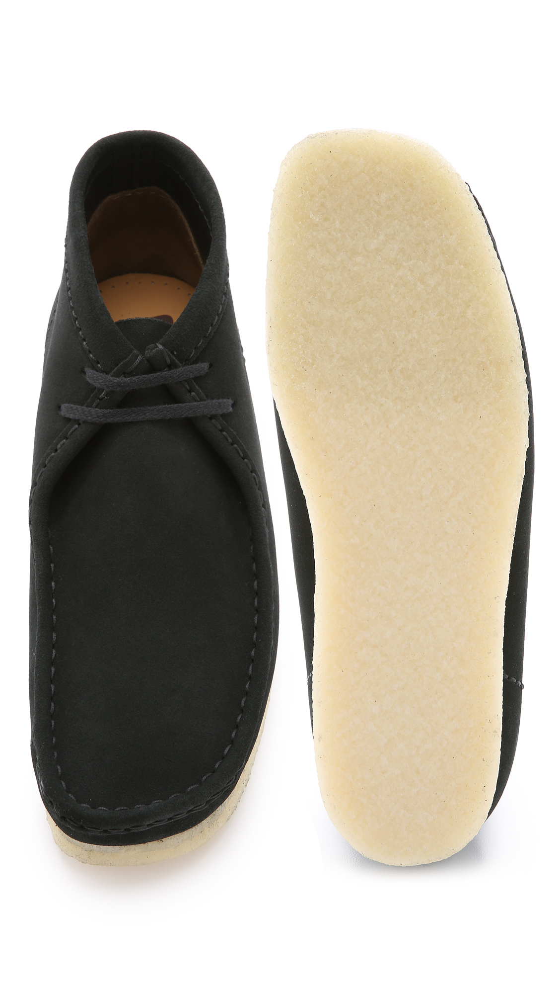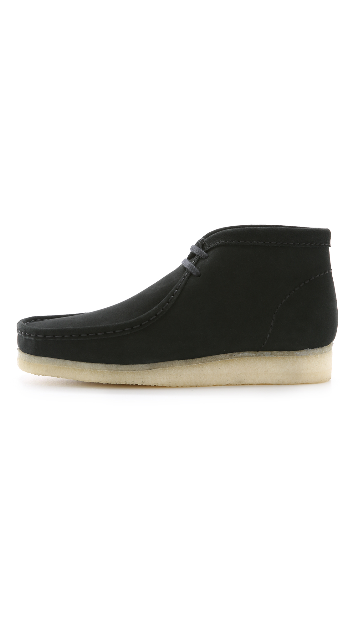 A re-release of the '60s moccassin-inspired Wallabee line, these suede Clarks boots have welted edges and a simple lace-up front. Gum sole. Cushion leather insole.