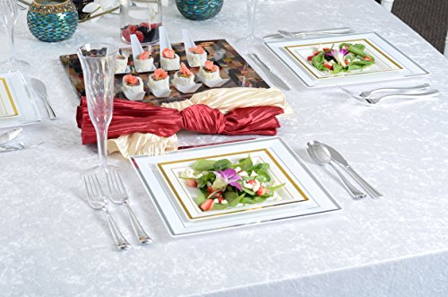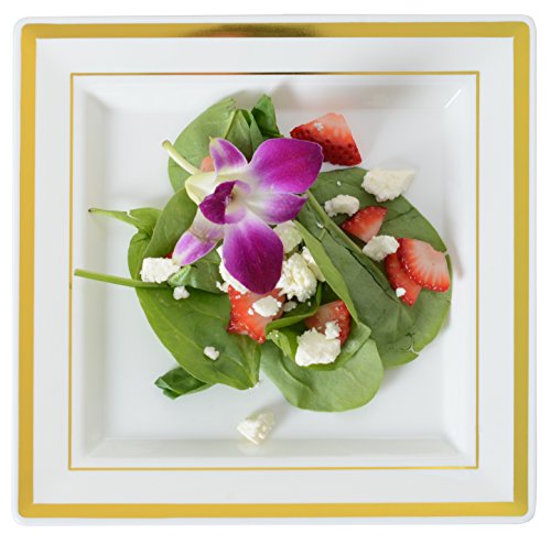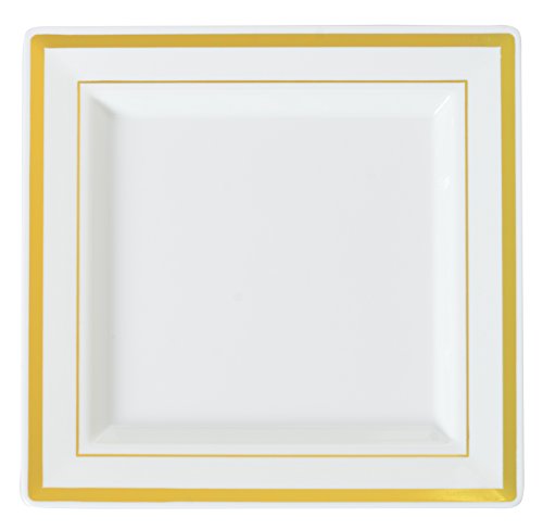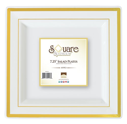 Product Description Premium square 7.25" Heavyweight dessert plate in bone color, with gold foil rim edge. Serve desserts or salads in these fine chin-look disposable plates. 0