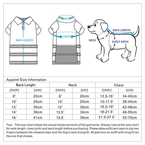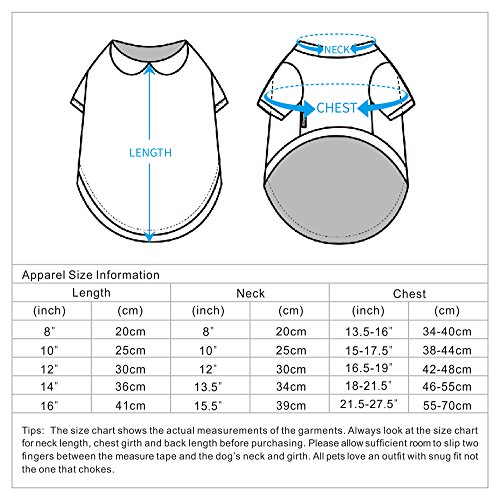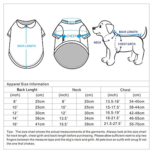 -. Feature : Pack of 3; Back Length 8", Chest girth 13.5"- 16", Neck 8"; Measure your dog from the base of the neck to the base of the tail for back length. / Summer vacation theme with a cool kick! Great summer wear for all breeds of pooches / Curved Hem and short sleeves / Made of 62% polyester, 33% cotton and 5% Spandex / Machine-washable, with similar color items, in cold water on the gentle cycle