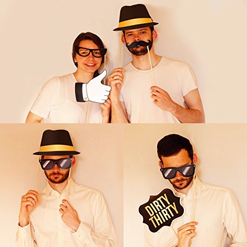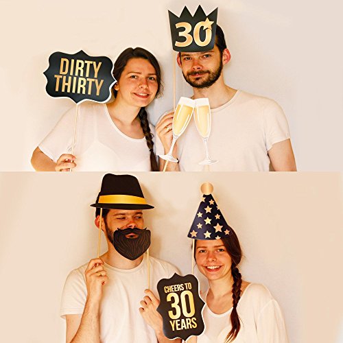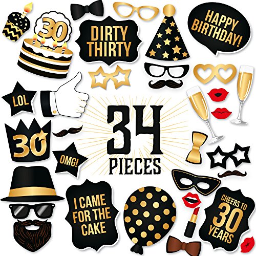PartyGraphix DIY 30th Birthday Party Photo Booth Props Kit – Suitable for His or Hers 30th Birthday Celebration Photo Booth. 34 Piece Kit Includes Black and Gold Props on a Stick