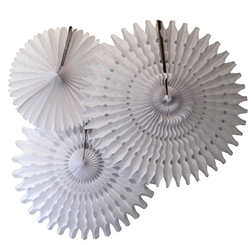 [Product Information]- Beautiful set of three white honeycomb tissue paper party fans - one 13 inch fan, one 18 inch fan, and one 21 inch fan
