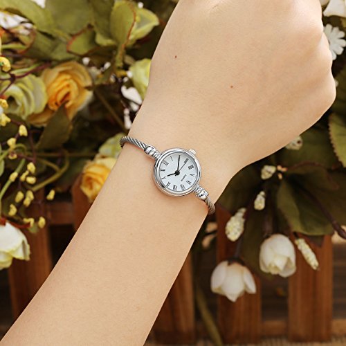 Top Plaza Womens Fashion Silver Tone Analog Quartz Bangle Cuff Bracelet Wrist Watch, Unique Elegant Stainless Steel Wire Band, Roman Numerals