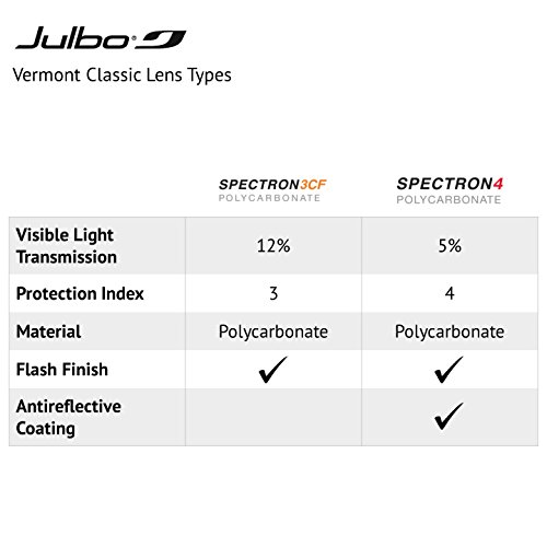 SPECTRON 3CF LENS: Julbo lenses provide 100% protection from UV A, B and C rays. Polycarbonate lenses are lightweight and offer very good shock resistance. Spectron 3 lenses are flash coated with a mirror effect, suitable for a wide range of activities, and blocks 89% of visible light.