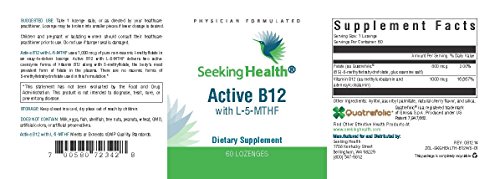 -. Binding : Health and Beauty -. Brand : Seeking Health -. EAN : 0828054148116 -. Feature : IMPORTANT: Active B12 with L-5-MTHF is manufactured for and sold exclusively by Seeking Health. We DO NOT recommend purchasing this product from any supplier other than Seeking Health on Amazon.com. / Provides 800 mcg of pure non-racemic L-methylfolate with 1,000 mcg of active Vitamin B12 (as methylcobalamin and adenosylcobalamin). / Free of common allergens. / Does not contain: milk, eggs, fish, shellfish, tree nuts, peanuts, wheat, or soy. / Tablets are sweetened naturally with cherry flavor and xylitol and are free of artificial flavors, colors and preservatives. Lozenges may be broken into halves or quarters as needed to adjust the dose. -. IsAdultProduct : 0 -. Label : Seeking Health -. Manufacturer : Seeking Health -. MPN : AB12L5-60-LOZ -. PackageQuantity : 1 -. PartNumber : AB12L5-60-LOZ -. ProductGroup : Health and Beauty -. ProductTypeName : HEALTH_PERSONAL_CARE -. Publisher : Seeking Health -. Studio : Seeking Health -. Title : Active B12 Lozenge With L-5-MTHF | 800 mcg of Pure Non-racemic L-methylfolate | 1,000 mcg of Methylcobalamin and Adenosylcobalamin Vitamin B12 | 60 Lozenges | Physician Formulated | Seeking Health -. UPC : 828054148116