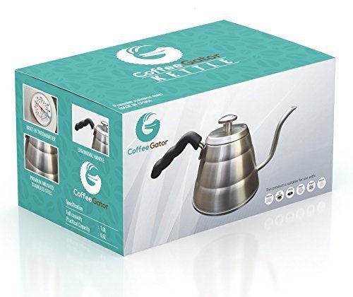 Studio : Coffee Gator Publisher : Coffee Gator Product Description Never burn your coffee again. The built in thermometer makes it easy to get the perfect temperature every time! Boiling water scorches your beans or ground and ruins flavor. Water that's too cold won't brew properly and will leave you with a flat, tasteless drink. Everyday kettles are the enemy of drip/pour over coffee. Water cannot be poured smoothly, it will splash and pour quickly - water does not have time to absorb the subtle flavors of your coffee grind. This kettle's gooseneck design gives a smooth and even pour for a coffee that is guaranteed to improve your day. Why Pour Over Coffee? Short answer: because it's awesome. Long answer: ? Makes amazing coffee with minimum fuss. ? Using a slow, steady stream of water at the right temperature makes the best use of the natural aromas, oils and flavours of your brew. ? Brighter and cleaner taste than French press method, and less dangerous than a stove-top percolator and just in a different league of taste to machine drip. ? Easy to clean. ? Makes you look cool - Impress friends with your coffee nerdiness :-) Remember. Bad coffee ruins lives! 0 |