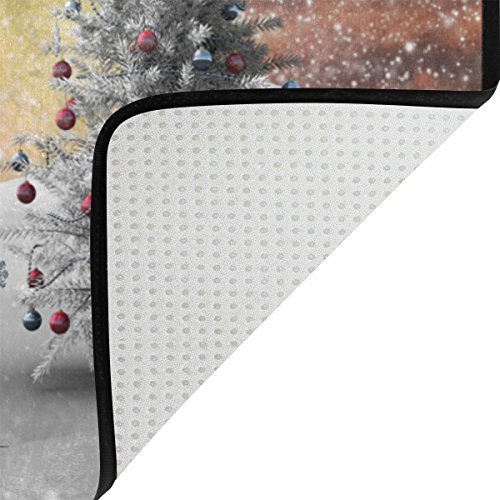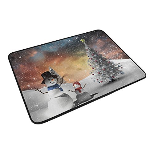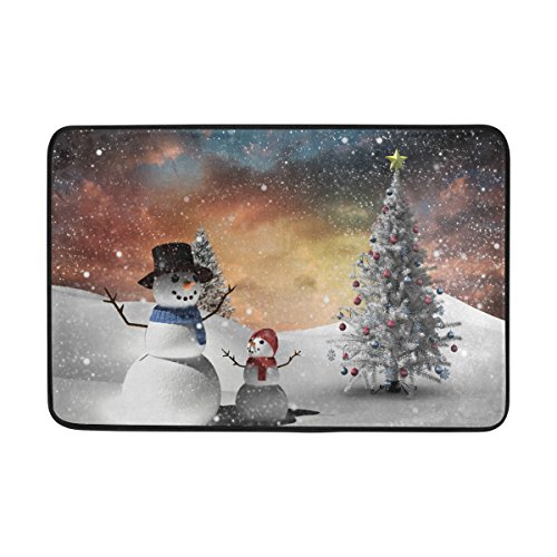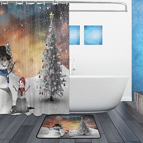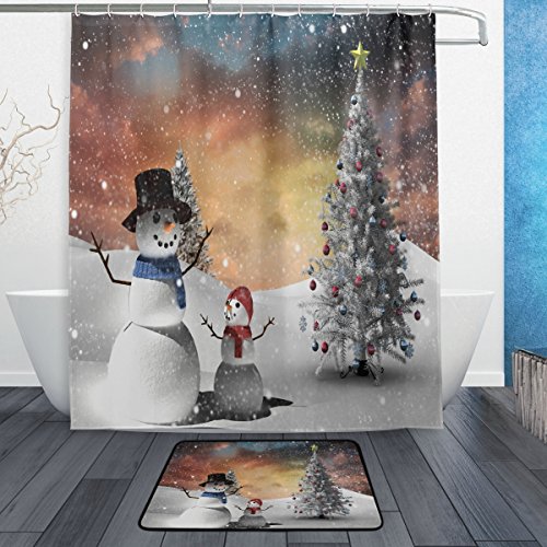 Merry Christmas Fir Tree and Snowman in Snowy Landscape Waterproof Polyester Fabric Shower Curtain (60" x 72") Set with 12 Hooks and Bath Mats Rugs (23.6" x 15.7") for Bathroom - Set of 2