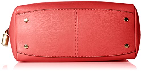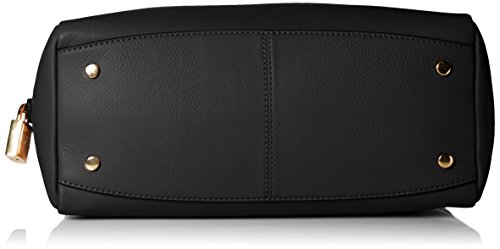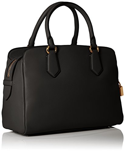 -. Feature : Two-handle leather bag featuring metallic padlock zipper pull, front logo, and bottom feet / Adjustable cross-body strap / Pockets: 3 interior slip, 1 interior zip, 1 exterior