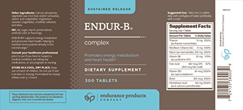 Endur-B Complex (Sustained Release) is ideal for healthy adults, especially dieters, athletes, mature adults and people interested in heart health, to ensure an optimal intake of B vitamins or fuel higher metabolic demands.* Endur-B Complex SR features high-potency B vitamins in a proprietary vegetable-based wax matrix specifically designed to release B vitamins gradually over a 5- to 7- hour period for optimal absorption and tissue retention.* Endur-B Complex SR provides a convenient, once daily solution to not only support heart health, but also nourish your whole body and energize your healthy lifestyle.* Endur-B Complex SR is free of salt, sugar, preservatives, artificial color or flavorings, and common allergens (milk, egg, fish, shellfish, tree nuts, peanuts, wheat and soy). As with all dietary supplements, consult your physician prior to use if you have or suspect a medical condition, are taking any medications, or are nursing or pregnant. See label for more details. *These statements have not been evaluated by the Food and Drug administration. This product is not intended to diagnose, treat, cure or prevent any disease.Feature