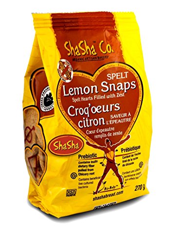 -. Binding : Grocery -. Brand : ShaSha Co. -. EAN : 0671372500100 -. Feature : They are made with no preservatives, additives, trans-fat or cholesterol; They are made with spelt flour, and are wheat-free; They are low in sugar and fat and made with an organic lemon extract; They are probiotic and prebiotic; Nut and dairy free -. IsAdultProduct : 0 -. Label : ShaSha -. LegalDisclaimer : This P.R.Ice is for one 9.5 ounce pkg -. Manufacturer : ShaSha -. NumberOfItems : 1 -. PackageQuantity : 1 -. ProductGroup : Grocery -. ProductTypeName : GROCERY -. PublicationDate : 2013-07-14 -. Publisher : ShaSha -. ReleaseDate : 2013-07-14 -. Size : 9.5 Ounce -. Studio : ShaSha -. Title : ShaSha Organic Spelt Lemon Snap Cookies, 9.5oz (270g) -. UPC : 671372500100