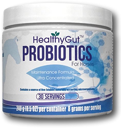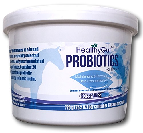 **NEW LABELS!** HealthyGutTM is the most advanced line of horse probiotics on the market. Our premium probiotics are made from human grade raw materials under a strict quality control program. Probiotics support the colonization of your horse's microbiome, the first defense of their immune system. This efficacious blend of carefully selected probiotic bacteria and yeast was formulated specifically for horses as an added defense against stress, digestive upset, and to aid hind gut support. Probiotics are known for their species specific abilities to: Make vitamins and enzymes | inhibit, out compete, and displace pathogenic bacteria such as Salmonella, Staphylococcus, E. coli, and Listeria| aid in digestion | support immune function | aid or assist in diarrhea control. These live, friendly micro-organisms are freeze dried to ensure quality. HealthyGutTM Maintenance contains prebiotics and 20 different species of probiotic organisms: 24 Billion CFU/ 8 gram Serving | 240X more probiotics than the leading brand per serving. The leading brand offers 100 million CFU/serving. 100 million = 0.1 billion Also contains the prebiotic Inulin, derived from chicory root, and yeast extract(super food Beta Glucan). Guaranteed Analysis: Direct fed micro-organisims ........ not less than 24 billion CFU* per 8 grams (Saccharomyces cerevisiae, Propionibacterium freudenreichii, Propionibacterium shermanii, Enterococcus thermophilus, Lactococcus lactis , Lactobacillus casei, Bifidobacterium longum, Pediococcus acidilactici, Pediococcus pentosaceus, Bifidobacterium bifidum, Bifidobacterium infantis, Bifidobacterium animalis, Bifidobacterium adolescentis, Lactobacillus brevis, Lactobacillus bulgaricus, Lactobacillus helveticus, Lactobacillus fermentum, Lactobacillus acidophilus, Lactobacillus plantarum, Lactobacillus reuteri) *Colony Forming Units NON-GMO Proudly Made in the USAFeature