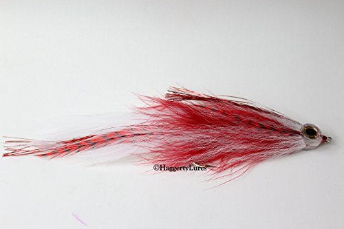 -. Feature : Hand tied Jointed Muskie Fishing Lures for Big Game Fly Fishing. Excellent trolling Lure can be used for Musky, Pike, Pickerel, Big Largemouth Bass, Smallmouth Bass and even Freshwater Stripers; any large predator will go crazy for the articulated flowing action of these flies. Peacock Bass from Florida to Brazil love the flashy colors.Great trailer or teaser when you want a larger profile baitfish for Saltwater Striped Bass, Grouper. There's nothing like catching a Shark on the Fly! / Every Haggerty Lure is currently hand tied to order in the USA. Many are tied by US Veterans in our Vises for Vets project, signified by an American Flag sticker on our packaging. Well-thought out articulated flies are 7" to 8" long on a sturdy Black Nickel 5/0 hook that can handle hard strikes and toothy critters. The joints allow the lure to move naturally in the water with increased action, mimics real fish movement. / Called by many names, the Muskellunge always puts up one heck of a fight, and catching one on a Fly will be the highlight of your fishing experience! / This fly has 1 joint, with a single hook towards the middle to rear of the fly. Hagg's Musky Lures feature the right bright flashy colors, premium Whiting grizzly feathers with a combination of Bucktail deer hair and marabou feathers, mixed with flash for the bling Muskies crave. Bucktail gives the fly stability and strength, while marabou flows enticingly, fluttering in the water to catch the attention of finicky fish. Total length is 7"-8" long.