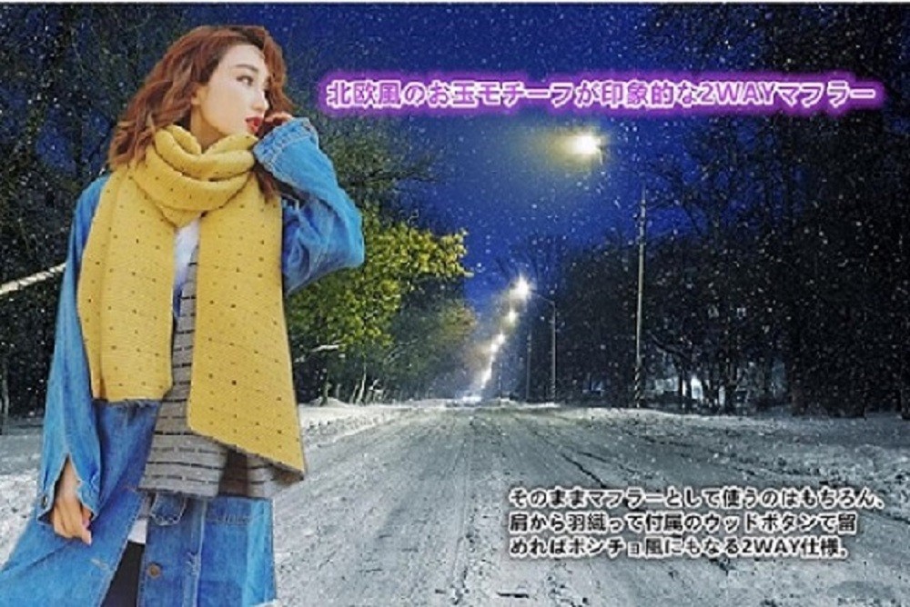 ころんと丸い北欧風のお玉モチーフが印象的な、ストールの登場です。玉柄なのに甘くなり過ぎず、大人の着こなしにほどよい華やぎをプラスしてくれます。保温性・通気性・吸湿性・放湿性に優れ、春夏の紫外線、冷房対策や、秋冬の防寒対策に欠かせない大判ストールです。カシミヤの生地を使用しています。見た目の高級感はもちろん、軽く、柔らかく、温かいのが特徴です。そのままマフラーとして使うのはもちろん、肩から羽織って付属のウッドボタンで留めればポンチョ風にもなる2WAY仕様。その日の気温やコーデに合わせて、表情を変えられるのが嬉しい。ひとあじ違う玉柄が目を惹くマフラーを、ぜひお試しください。 イミテーションカシミヤ(100%アクリル)素材で、肌触りが抜群です。また、性別、年齢層を問わずに、末永く使っていただけます。ころんと丸い北欧風のお玉モチーフが印象的な、ストールの登場です。玉柄なのに甘くなり過ぎず、大人の着こなしにほどよい華やぎをプラスしてくれます。保温性・通気性・吸湿性・放湿性に優れ、春夏の紫外線、冷房対策や、秋冬の防寒対策に欠かせない大判ストールです。カシミヤの生地を使用しています。見た目の高級感はもちろん、軽く、柔らかく、温かいのが特徴です。そのままマフラーとして使うのはもちろん、肩から羽織って付属のウッドボタンで留めればポンチョ風にもなる2WAY仕様。その日の気温やコーデに合わせて、表情を変えられるのが嬉しい。ひとあじ違う玉柄が目を惹くマフラーを、ぜひお試しください。 イミテーションカシミヤ(100%アクリル)素材で、肌触りが抜群です。また、性別、年齢層を問わずに、末永く使っていただけます。