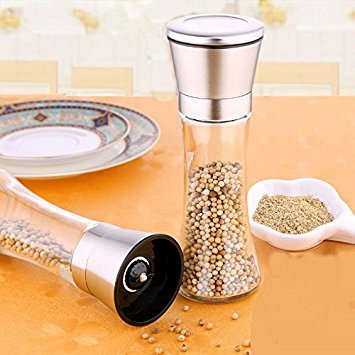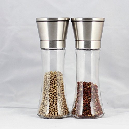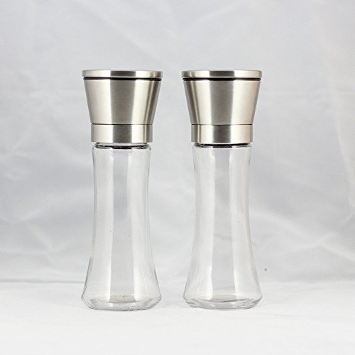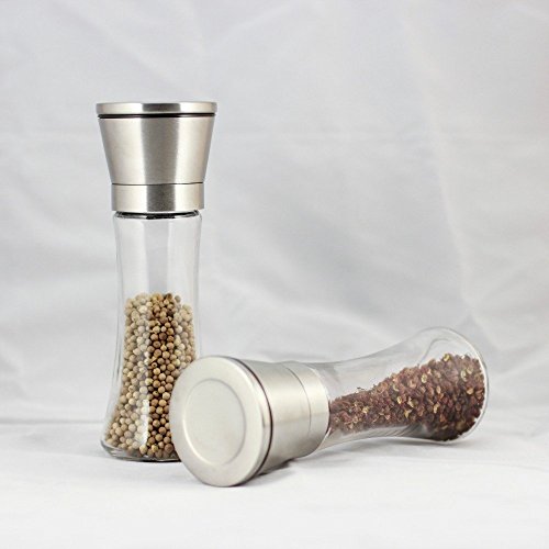Salt and Pepper Mill Set Grinde Brushed Stainless Steel Salt and Pepper Mill - Glass Body Refillable Spice Grinders -Set of 2