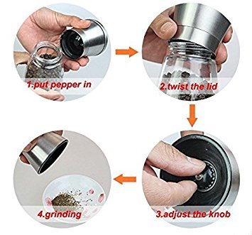 NO MORE MESS TO CLEAN - EASY TO CLEAN AND DISASSEMBLE: Our salt & pepper grinders have a premium brushed stainless steel top that is easily unscrewed by twisting counter clockwise. Easy to refill wide mouth glass. All parts can be cleaned with warm water and soap.