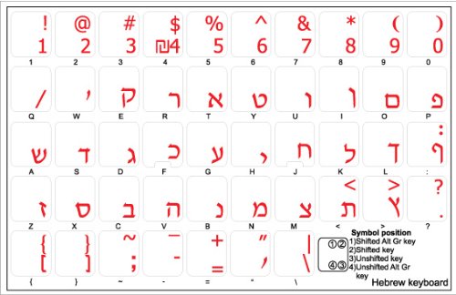 HEBREW KEYBOARD STICKERS WITH RED LETTERING ON TRANSPARENT BACKGROUND