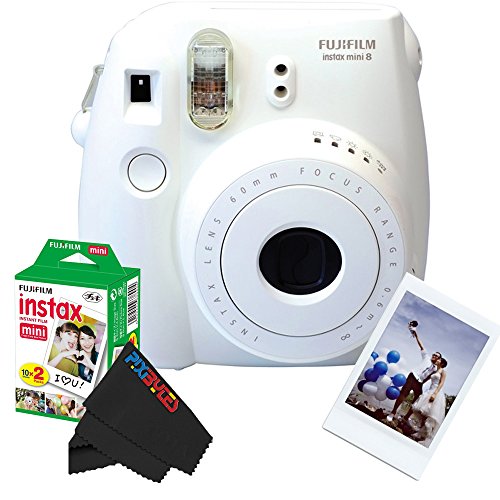 Fujifilm Instax Mini 8 Instant Film Camera (White) + Fujifilm INSTAX Mini Instant Film (Twin Pack) + PixiBytes Exclusive Cleaning Cloth