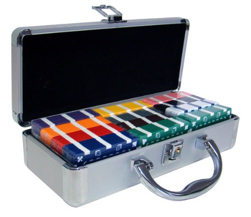 This set of 60 European-style rectangular poker plaques is a great addition to any poker game. The plaques come packaged in a stylish aluminum case with a handle. Each plaque within the set measures 2 7/8" long, 1 3/4" wide and 1/8" thick. The outer edge of each plaque is decorated in a suited pattern with dice in between each suit. Each plaque weighs 32 grams, making them much heavier than normal chips. However, you can still shuffle and play with them like traditional round poker chips.